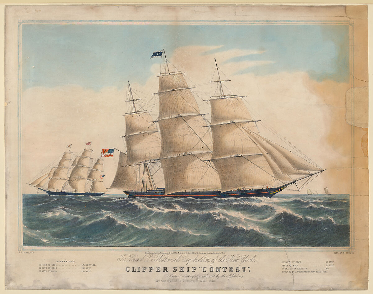 Marine views and other pictures of ships at sea have long appealed to collectors and popular taste. After gold was discovered in California in 1849, fast ships were needed for cargo trade and passenger transport. New York City shipbuilders soon excelled at constructing the finest, fleetest and best equipped clipper ships, and Nathanial Currier's lithography firm was eager to satisfy the public's desire for pictures of these ships. The clipper ship "Contest" was built in the noted shipyards of Jacob A. Westervelt in 1852; this print is dedicated to his son, Daniel D. Westervelt, who is identified as the builder of "Contest." Its first voyage from New York to San Francisco took 100 days; the return journey was made in 80 days. Over the next decade, this ship made numerous lucrative trade voyages; in 1863, during the American Civil War, it was destroyed by the Confederate ship "CSS Alabama."