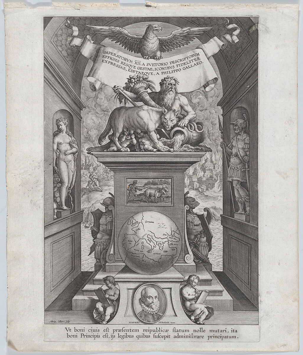 Title page for the series 'Roman Emperors on Horseback'. Depicted is a personification of the river Tiber with the wolf feeding Romulus and Remus at center and an eagle overhead, Venus in niche at left and Mars at right, a portrait of Johannes Stradanus at bottom center, Troy burning in the background with Aeneas and his father fleeing at left.
