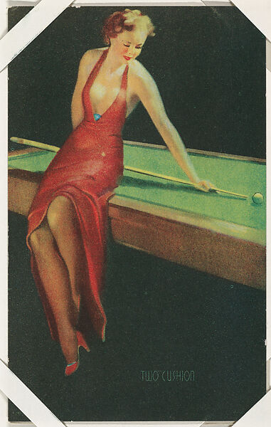 From Glamour Girls series (W424). (The actual title for this series is "Glorified Glamour Girls"). Published by International Mutoscope Reel Company 1940. Sold through arcade vending machines. From a set of 32. Postcard-sized thick card. Full color. Blank back. Gil Elvgren artist. Printed across bottom of card: A MUTOSCOPE CARD © MADE IN U. S. A.