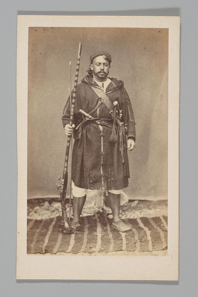 The carte de visite, a format comprised of an approximately 2 x 4 inch photograph mounted to card stock, was perhaps the most ubiquitous of nineteenth-century photographs. The French studio portrait photographer André-Adolphe-Eugène Disdéri first patented the carte in 1854. His innovation of exposing not just one but eight photographic images on the same glass plate negative enabled cartes to be made cheaply and reproduced on a mass scale. During the late 1850s and throughout the latter half of the century, these economical keepsakes depicting portraits of loved ones, celebrities, monarchs, and foreign types circulated en masse and spurred a veritable "cartomania." Collected in albums, traded among friends, and admired in drawing rooms, cartes put photography in the hands of virtually everyone, and thus offered a means of reflecting upon one’s own social standing in an ever-expanding world.