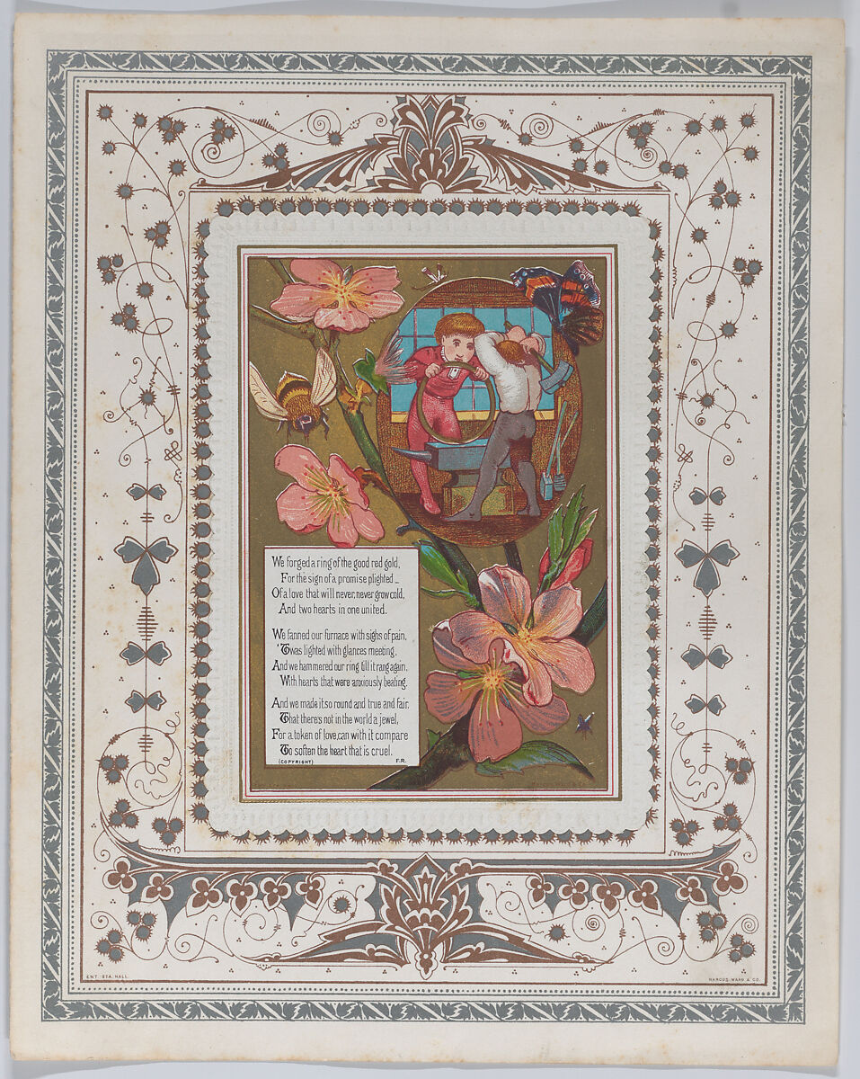 - Medium: White card stock with embossed, scalloped borders; chromolithography in colors and gold, silvered lithographed paper
