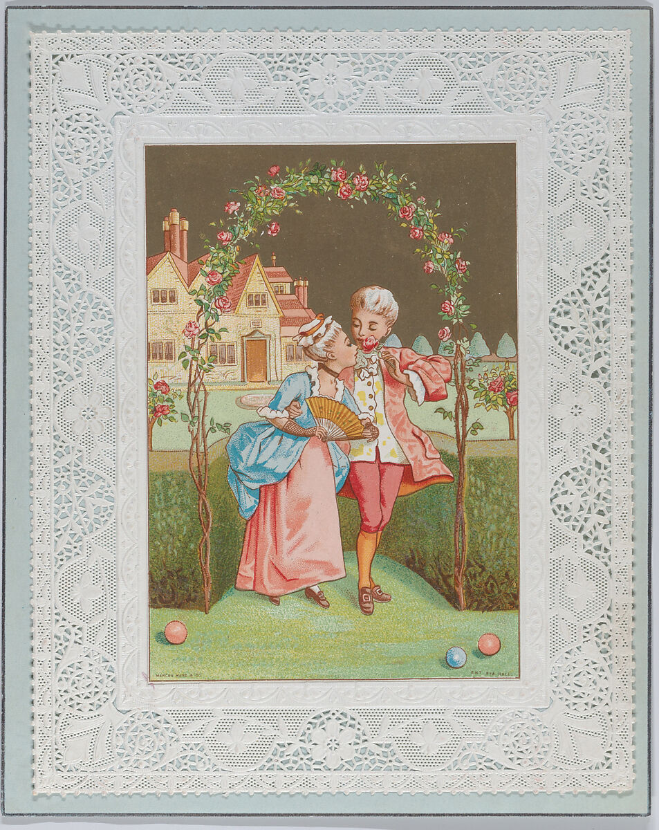 • Medium: White card stock with gilding; chromolithography, gold lithography, blue paper, blue watercolor, cameo-embossed lace paper
