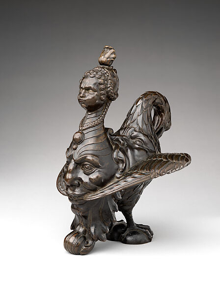 This work of art is currently on loan to the museum.Intended to be filled partway with water through an opening in the sphinx’s headpiece and then heated, this mysterious vessel releases pressurized steam through a pin-sized hole between her lips. If blown over glowing coals, the steam can create a flammable gas composed of hydrogen and carbon monoxide, so that the sculpture appears to spit fire just like the mythological sphinx. Artistically crafted aeolipiles served as display pieces and were used to distribute the heat of hearth fires.
