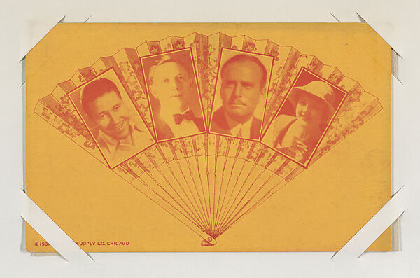 From Movie Stars Exhibit Fan (W403). Distributed by Exhibit Supply Company. Dispensed in arcade machines. Postcard-sized thick card. One color. 32 cards in set. Includes an open fan with four unidentified movie stars. On back is writeup about the card promotion and prizes with coupon at one corner.
