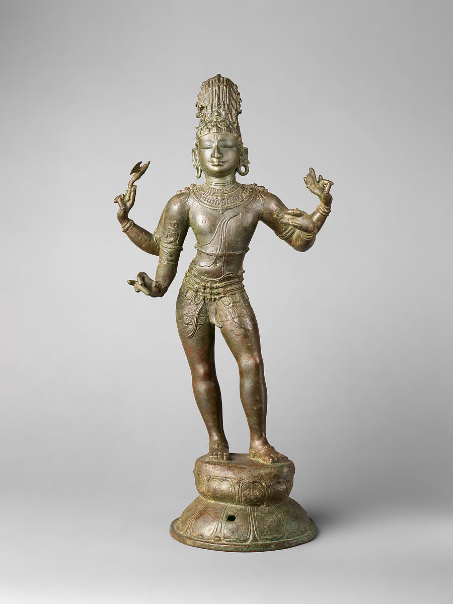 This regal figure of Shiva as the supreme victor over the three cities of the demons is one of the greatest realizations of Shiva as the destroyer of evil. It is a masterpiece in the corpus of imperial-quality devotional bronze icons and was likely made during the peak of imperial Chola production under Rajarajachola I or his immediate successors. Infused with all the majesty of a conquering king, Shiva in this manifestation was much revered by Chola rulers, both as their spiritual protector and as a divine role model for their imperial ambitions.