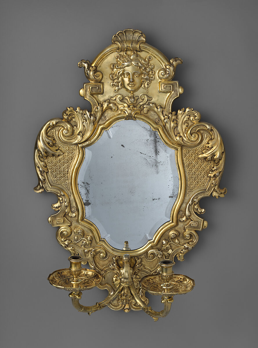 Once part of Augustus the Strong’s substantial silver-gilt furniture ensemble at Dresden Palace, these monumental reflective wall-lights embodied the power, wealth, and magnificence of their patron, who was Elector of Saxony and King of Poland. During his grand tour of Europe, in 1687, Augustus visited Versailles, where he admired the already-legendary silver furniture of the Sun King shortly before Louis XIV had it melted down. After ascending the throne in 1694, Augustus emulated the French monarch’s solar symbolism, including, as here, the powerful and energetic design referencing the sun god Apollo. This allusion would have been especially pronounced when the sconces were in use because the mirrors intensified the flickering golden light of the candle flames.