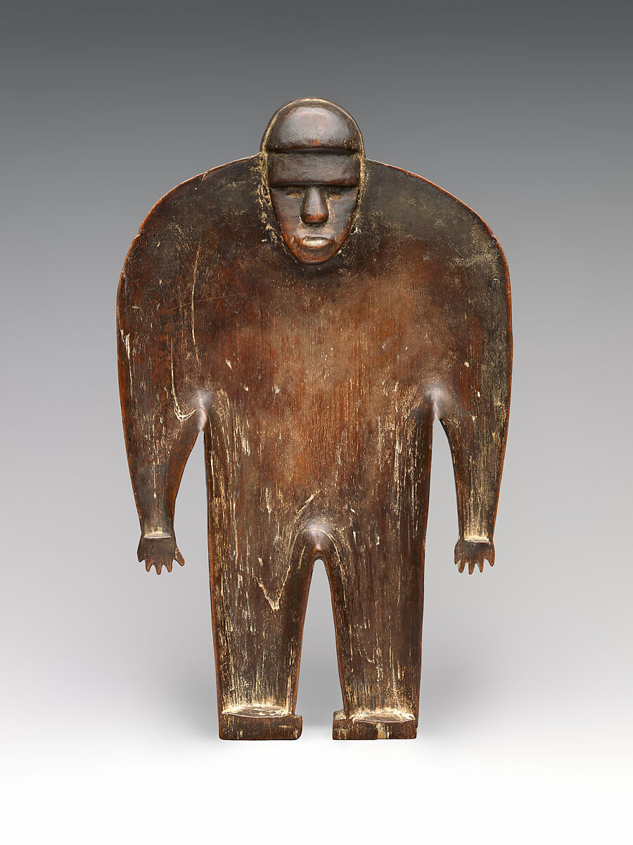When placed upright, the figure assumes an extraordinarily powerful presence. Hollow eyes gaze directly ahead, lips gently parted, as if in a trance-like state echoing the context of its original use. The figure’s arms drop loosely down at each side and feature delicate hands with palms turned out as if in supplication, a nuanced reference to the solemnity of the rituals for which it was designed. The flat planar quality of the shallow vessel coupled with the bold volumetric head and corporeal presence create a formal tension at once dynamic and powerful. Above the concentrated brow of the ancestral figure is a simple raised ridge, likely a reference to the red and green feather headband worn by Fijian priests. These were composed of a woven fiber base to which the bright and colorful red and green feathers of the lorikeet attached. These feathers activated the connection with the spirits of deceased ancestors and gods during ritual.