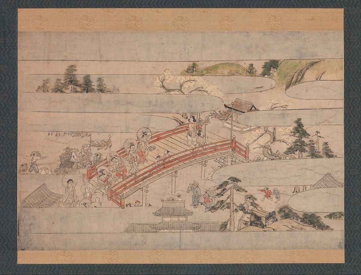 This scene, a detached section from a set of three illustrated narrative handscrolls (emakimono), presents the conclusion of the amorous tale of a Buddhist monk and his young acolyte, who in a previous scene has taken his own life by drowning. A procession for raigo-e, a ritual ceremony celebrating Amida Buddha and his retinue of bodhisattvas, descends and crosses a bridge to welcome the souls of the departed and guide them to paradise with music and song.