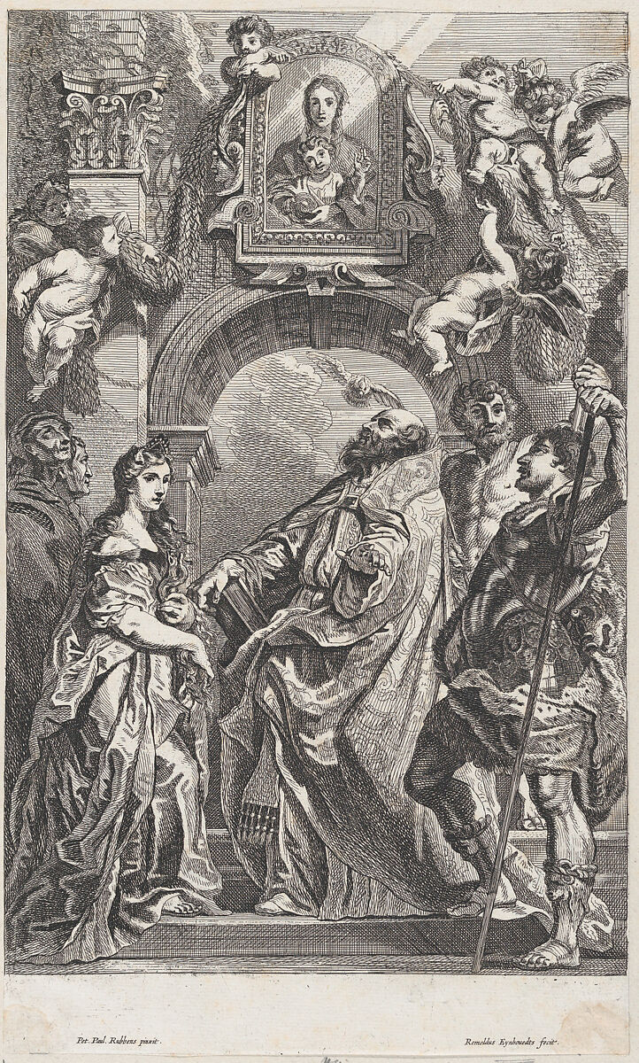 - Title: Saint Gregory and other saints in front of a gateway with a portrait of the Virgin, cherubs overhead