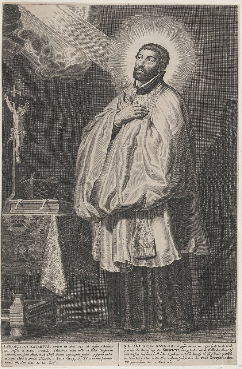 - Title: Saint Francis Xavier with a divine light emanating towards him from the upper left, with a crucifix, mitre, and book on a table at left