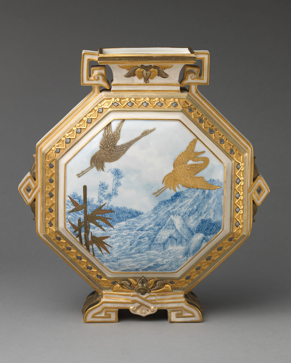 - Medium: Bone china "ivory porcelain" with underglaze blue and gilding