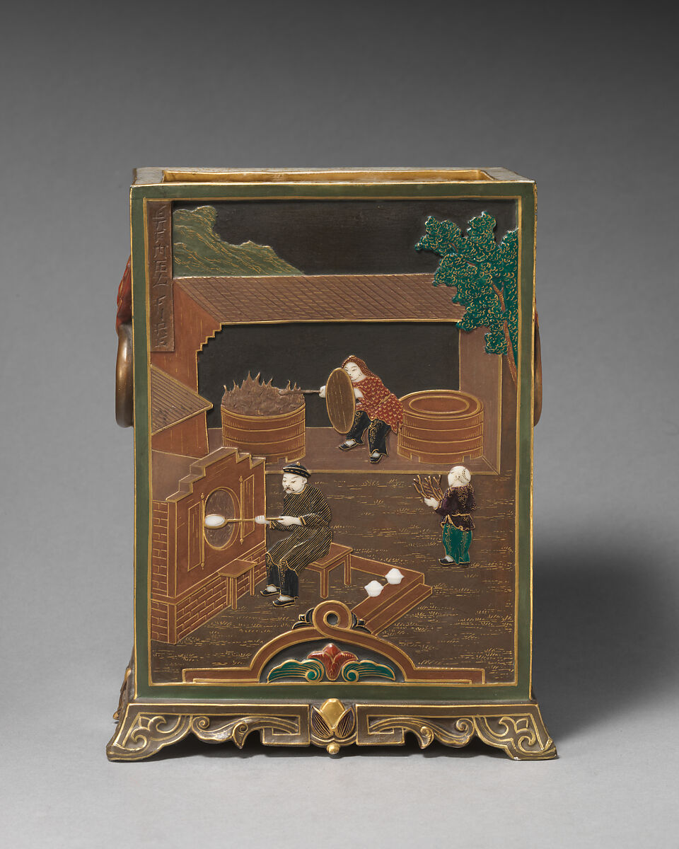 - Title: Rectangular vase with porcelain-making scenes ("the oven for burning clay" and "the painting of the wares")