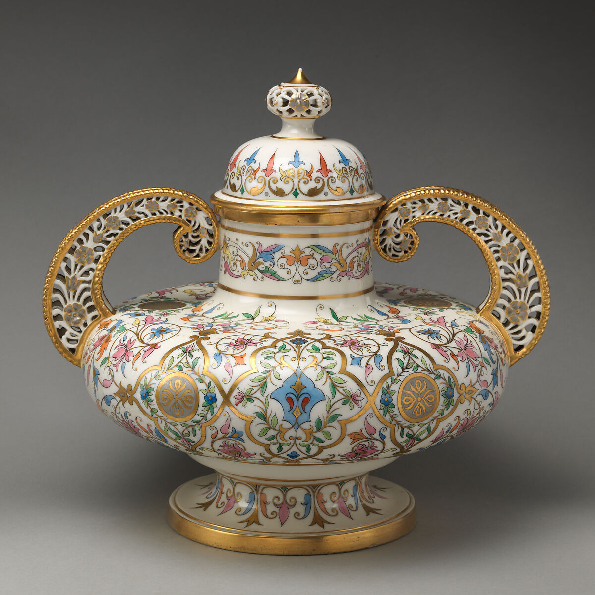 The history of the Derby porcelain manufactory can generally be divided into two periods. The old Derby porcelain was produced from 1750 to 1848, and was foremost distinguished by the ownership of William Duesbury I and II. When the original factory closed in 1848, a number of former workers established a separate smaller factory at King Street, Derby, using Crown Derby’s original molds and patterns and oftentimes incorporating the factory marks on its wares. Around 1876, a separate company established a factory at Osmaston Road under the name Derby Crown Porcelain Company (and eventually bought the King Street factory in 1935), although the firm did not being producing commercial pieces until two years later. In 1890, the factory was granted the privilege of using the title "Royal Crown Derby Porcelain Company." Although the new Crown Derby continued to produce the firm’s old eighteenth-century Japan patterns, it became known for making vessels lavishly decorated with raised and chased gold work and Persian-style decoration.