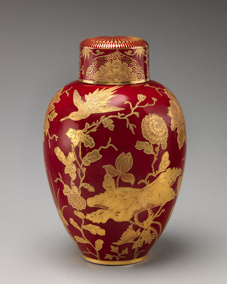 The history of the Derby porcelain manufactory can generally be divided into two periods. The old Derby porcelain was produced from 1750 to 1848, and was foremost distinguished by the ownership of William Duesbury I and II. When the original factory closed in 1848, a number of former workers established a separate smaller factory at King Street, Derby, using Crown Derby’s original molds and patterns and oftentimes incorporating the factory marks on its wares. Around 1876, a separate company established a factory at Osmaston Road under the name Derby Crown Porcelain Company (and eventually bought the King Street factory in 1935), although the firm did not being producing commercial pieces until two years later. In 1890, the factory was granted the privilege of using the title "Royal Crown Derby Porcelain Company." Although the new Crown Derby continued to produce the firm’s old eighteenth-century Japan patterns, it became known for making vessels lavishly decorated with raised and chased gold work and Persian-style decoration.