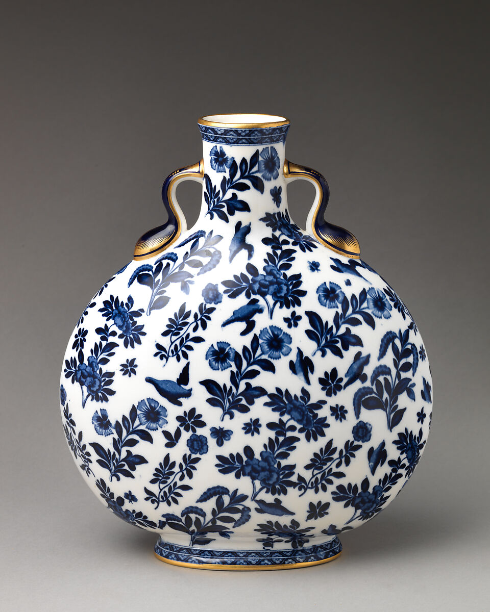 Minton was the most important ceramics factory during the Victorian period and began exhibiting products at the first Great Exhibition of 1851. Founded in 1793 by Thomas Minton at Stoke-on-Trent, the firm initially specialized in transferware pottery before expanding under the ownership of Thomas’s son Herbert Minton, beginning in 1836. Under the ownership of Colin Minton Campbell, who succeeded his uncle in 1858, the factory became recognized as a specialist producer of Aesthetics movement porcelain, which were inspired by a rich array of exotic and eclectic decorative motifs.