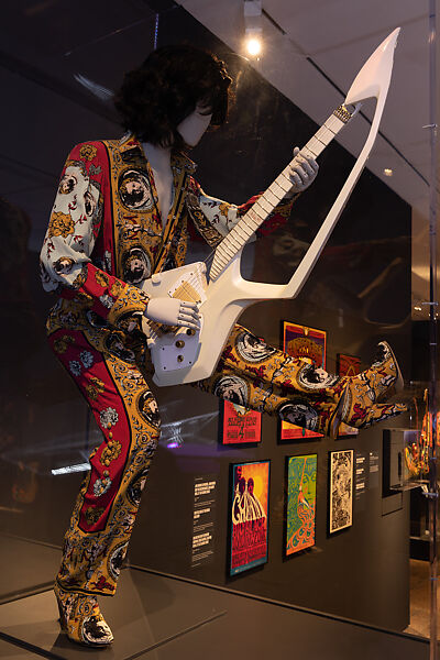 This work of art is currently on loan to the museum.Prince wore this baroque-inspired cherub-patterned suit in live performances throughout the early to mid 1990s, often when he performed with his Auerswald Model C guitar, on display nearby. The print and fabric was designed and produced by Helen David of English Eccentrics. The suit was designed by Prince and his in-house costume designer, Helen Hiatt.