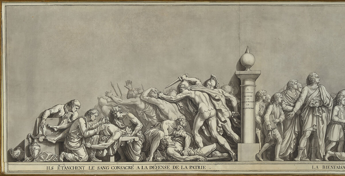 Gibelin’s design, as seen here, celebrated royal patronage of the school for surgeons and was divided into three sections. On the left, amid an ongoing battle, doctors are cast as war-time heroes, assisting the wounded on the battlefield, tying bandages around their wounds to staunch the bleeding. In the center, the French king (Louis XV at the time Gibelin received the commission, but Louis XVI by the time he completed it) in the guise of a Roman emperor is seated before a grateful crowd as a winged figure descends from the sky to place a crown of hearts atop his head. The crowds around him mix classical figures and attributes with others in contemporary dress, including the young medical students at left, one of whom holds a book and another an anatomical drawing. On the right, the ancient Greek god of medicine, Asclepius, directs a dissection as older bearded men in classical attire listen attentively and take notes.