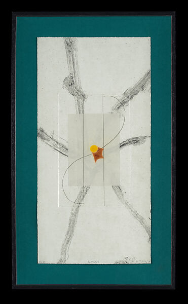 Although abstract, Blossom contains multiple allusions to the natural world and its life cycles. The colors and lines evoke organic materials and generative processes, as does the verdant background, which, like the work’s frame, was chosen by the artist. Tuttle used the stem of a plant to create thick, irregular black markings that contrast with the thin vertical and curving lines framing the glowing yellow circle and irregularly shaped red form. Light seems to emanate from the center and radiate throughout the composition. Tuttle explores interactions of unconventional forms and often humble materials, and engages with both overlooked support systems (such as the mat and frame) and the ways in which his art is displayed.