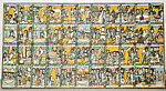 Composed of tempera on canvas, this painting is divided into a series of forty-four vignettes narrating the story of the Queen of Sheba and her visit to King Solomon. This story is part of the Ethiopian national saga, the Glory of the Kings (Kebra Nagast). The vignettes are arranged in groups of 11, divided into four horizontal sections. Each vignette is framed at the top and bottom by a line of text written in Ge’ez. The ground colors are ochre and blue with highlights in white, brown and green.we