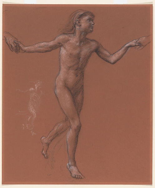 This sensitive rendering of a pre-adolescent nude demonstrates Poynter's accomlished late draftsmanship and characteristic use of black and white chalks on reddish paper – the latter providing a middle tone. A related figure appears in his painting "Horae Serenae" ("Serene Hours," now Bristol City Museum and Art Gallery), exhibited at the Royal Academy in 1894. A preeminent academic draftsman, Poyner became Director of the National Gallery in the latter year, and President of the Royal Academy in 1896. He typically made life studies for each figure in his paintings, often devoting additional details to arms and hands.