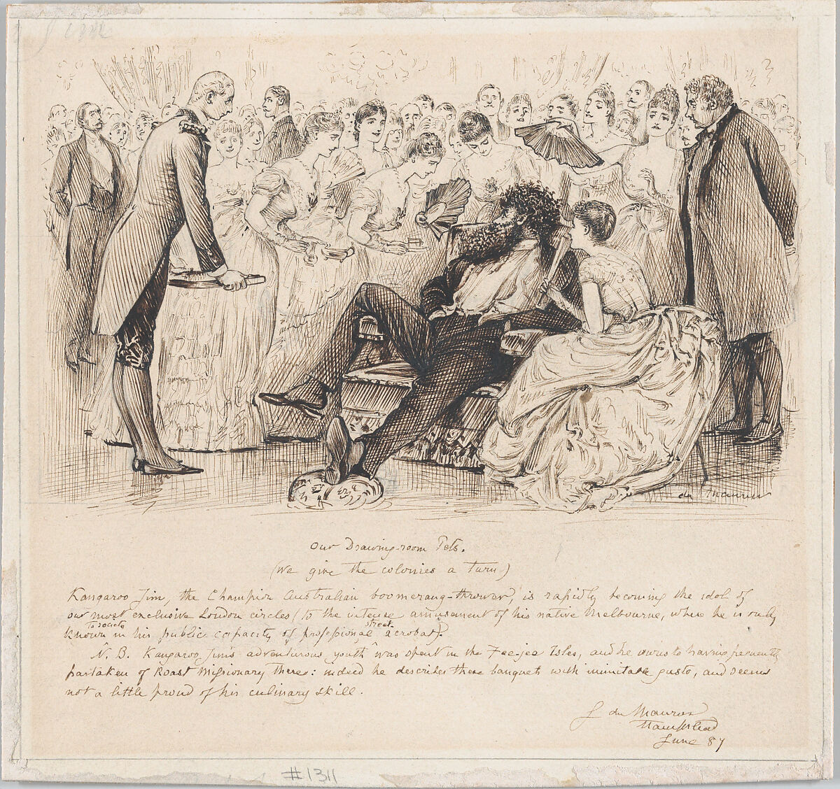 Du Maurier pokes fun at London society's fascination with the exotic by showing fashionable young women fawning over a burly Australian street performer as their perplexed male companions look on. The celebrity sprawls in a throne-like chair and is fanned by ladies who offer him tea. Text below reveals details of "Kangaroo Jim's" rough early life in Fiji. The image was published in "Punch" on July 2, 1887 and responds to current issues such as Darwinism. The artist had a significant impact on British culture from the 1860s through the 1890s as a talented illustrator, popular cartoonist, and author of the novel "Trilby" (1894).