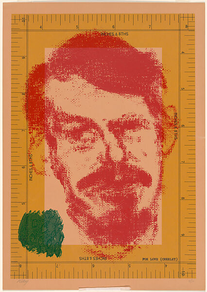 After serving in the U.S. Army in France and Germany in the 1950s, Kitaj moved to England to study art under the G.I. Bill. As a student at the Royal College of Art, Kitaj was recognized for his accomplished draftsmanship, a skill also evidenced in his prints. In 1966 he embarked on a portfolio of prints depicting contemporary poets mainly from Black Mountain College, an experimental college in North Carolina. The subject of the first print is Robert Creeley, a friend and later collaborator of the artist’s. Kitaj had Creeley sit for a portrait sketch in pastel, which was photographed, transferred to a screen, and printed.