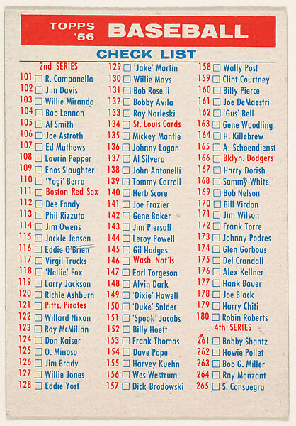 Baseball Checklist, Series 2/4, from the "1956 Topps Regular Issue" series (R414-11), issued by Topps Chewing Gum Company
