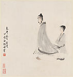 A bearded scholar stands in an undefined void with a boy attendant at his side. The scholar looks down, as if lost in reverie. The boy stands at attention, hands covered in his sleeves, waiting for his master’s command. Painted in 1947, in the midst of a decade-long bitter conflict for control of China, this image seems to capture some of the painter’s fatigue with seemingly endless war. The inscription indicates that the painting was made for presentation to a certain Mr. Keping 克平.