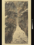 In tones of smoky blue and light sienna, Fu Baoshi presents the precipitous drama of the Yangzi River gorges as a wall of rock engulfing a small triangle of river. Boats diminish in scale as they sail downriver on choppy waves that are rendered in quick, swiping strokes of dilute ink against the white ground. On the sheer fliff faces, hints of trees and rocky textures are suggested by swirls and swipes of ink mixed with broad washes. Fu Baoshi painted this dark, brooding depiction of a majestic Yangzi River Gorge in 1947, after returning from Sichuan to his native Nanjing.