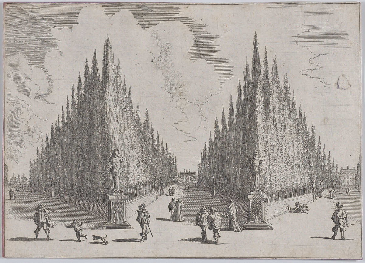 - Title: Three alleés separated by two groups of trees in pointed configurations, from 'Views of Gardens' (Vedute de' Giardini)