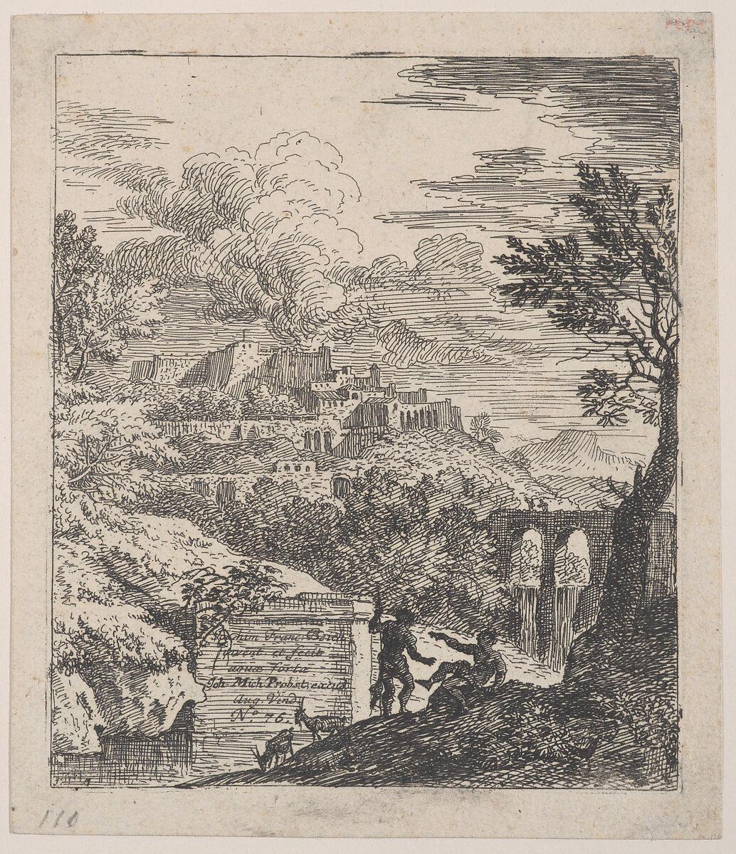 - Title: Two shepherds resting next to a pedestal, an aqueduct at right in the background, and a city on a hill at left in the background, from 'Landscapes in the manner of Gaspar Dughet'