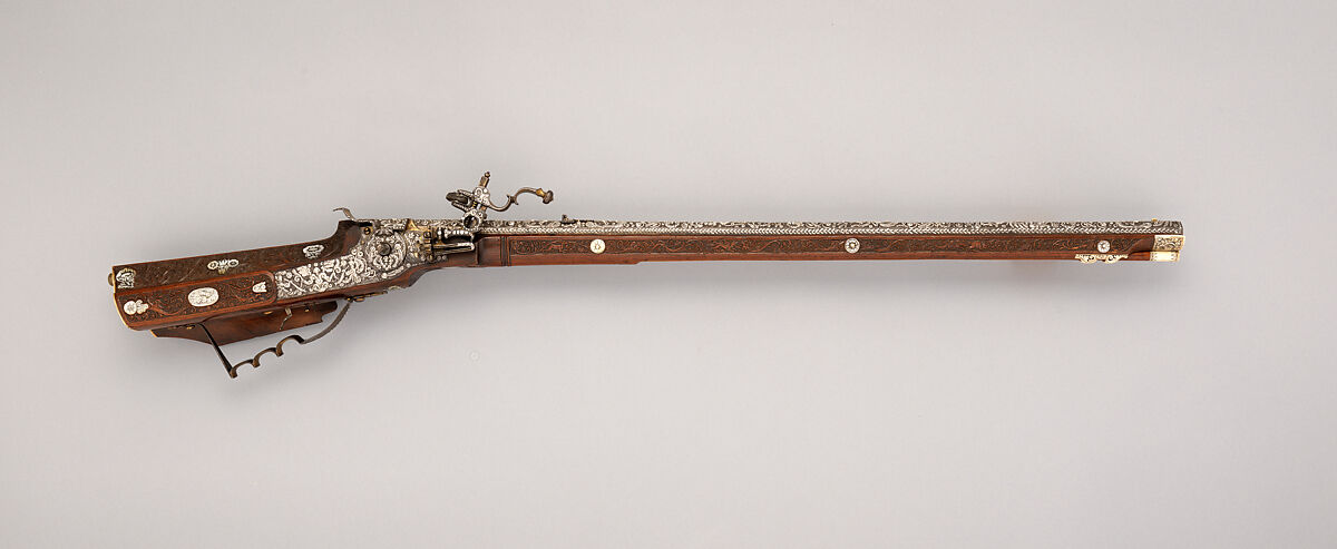 A masterpiece of German baroque gunmaking, this luxurious wheellock rifle is one of the finest examples produced by the anonymous gunstocker called the Master of the Animal-Head Scroll, after the eponymous design motif that appears throughout his work. Probably employed by the imperial court in Vienna, he was active between 1624 and 1659, the dates recorded on his earliest and latest-known firearms. Characteristic of this master's work is the carving of the stock, with leafy tendrils ending in animal or bird heads, and the recessed background, which is either stippled or matted for contrast and, often, engraved with foliage. This rifle is among the most elaborately decorated works in the master's oeuvre, particularly the barrel, lock, and other metal parts––all intricately worked, chiseled, gilt, and encrusted with high-relief silver ornament––as well as the stock, which is extensively carved and inlaid with mother-of-pearl plaques. The silver escutcheon engraved with a crozier, which is set into the stock behind the barrel, suggests that the rifle might have once belonged to a prince-bishop of Eichstätt in Bavaria, perhaps Johann Christoph von Westerstetten (1563–1637, prince-bishop from 1603) or his successor, Marquard II, Count Schenk von Castell (1605–1685, prince-bishop from 1637).
