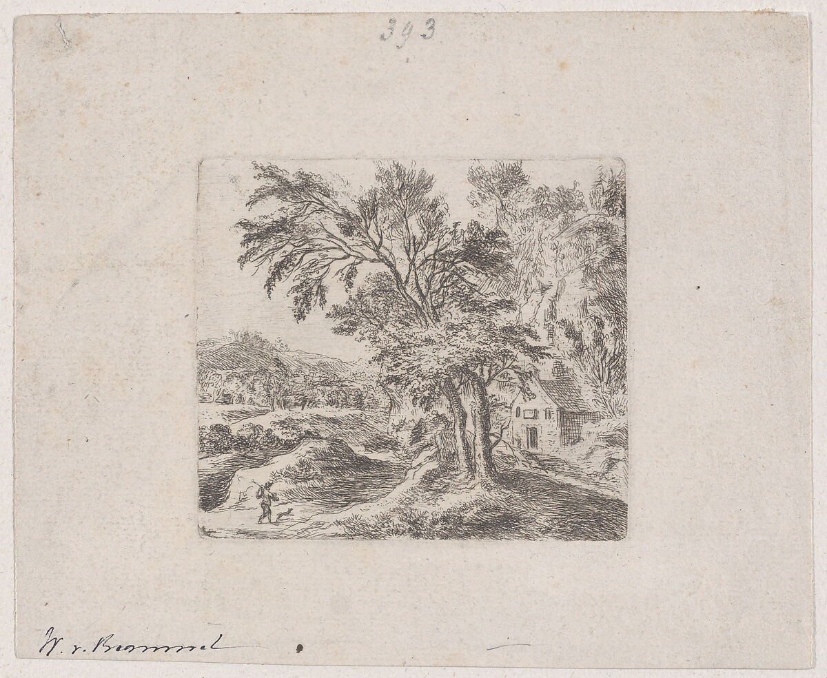 - Title: Landscape with a man and a dog at lower left, two trees and a house at right, hills in far distance