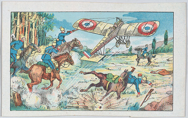 Translation of description on verso: After having successfully traversed and bombed the German lines, a French monoplane intended to declare victory from the start, but an engine breakdown forced him to land close to enemy lines: a patrol of Uhlans, who had followed the pilot's movements from afar, charged, to surprise him, arriving at the same time that the pilot flew upwards, outwitting his pursuers.