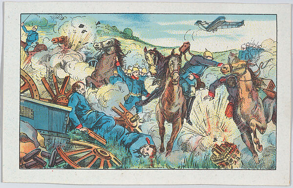 Translation of description on verso: The troops of the Allied armies charged to meet the German soldiers, who, under cover of artillery and with the help of asphyxiating gas bombs, tried to seize the first line of trenches.
