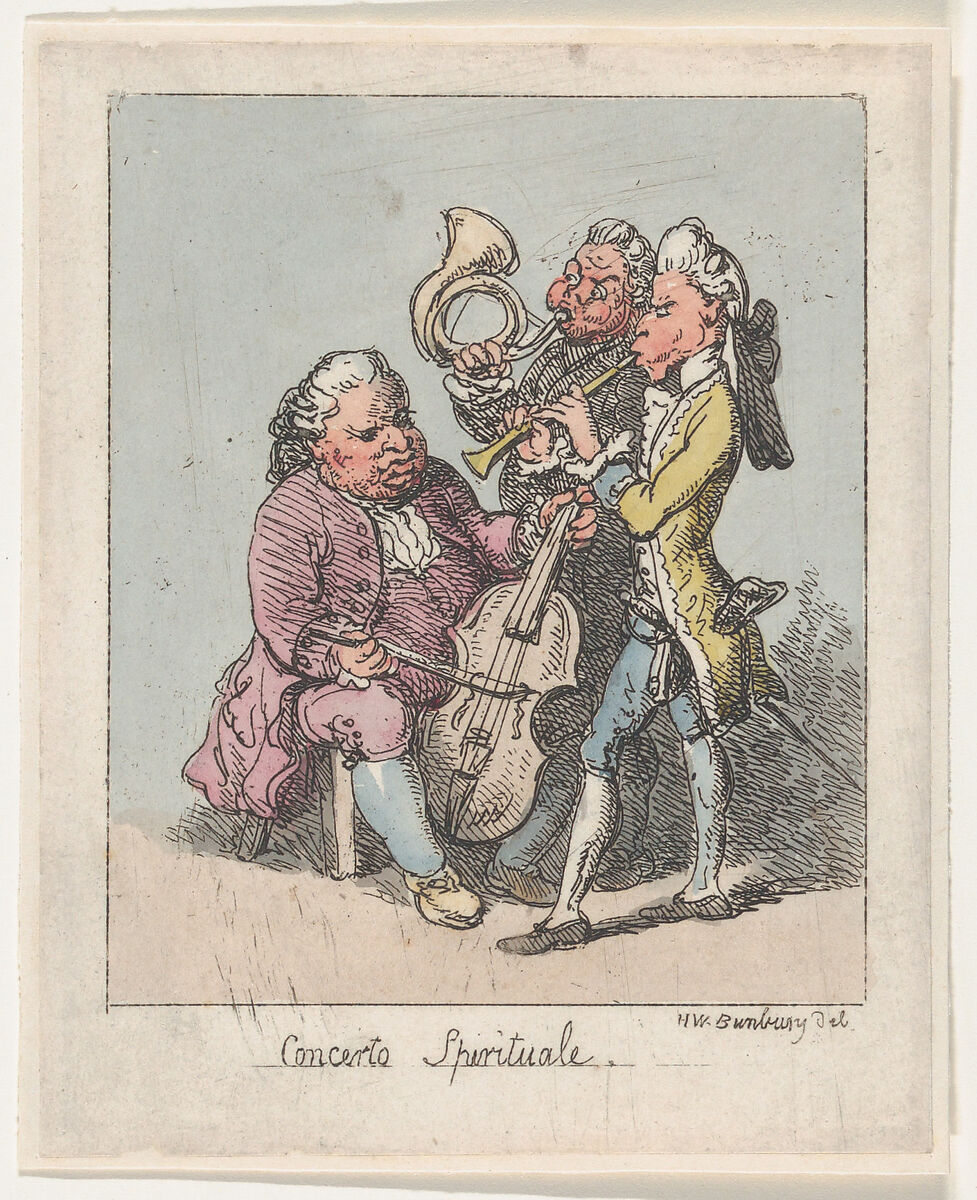 This early 19th century print reissues an image first published in 1773, a decade when concerts of religious music were performed regularly at the Theatre Royal, Covent Garden. The viol da gamba player likely represents Carl Friedrich Abel, or possibly Johann Christian Bach. The oboe player has been identified as Johann Christian Fisher, and the French horn player as Giovanni Punto (born Jan Stich). These men came to London from the Continent hoping to take advantage of the patronage of George III–the British king was also prince-elector of Hanover, married Charlotte of Mecklenburg-Strelitz, and enjoyed German music.