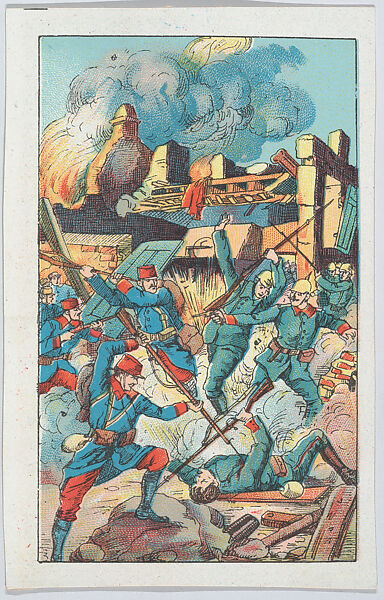 Translation of description on verso: French soldiers heroically take the village of Carency house-by-house, despite enemy fire and the tenacious resistance of the German troops, demonstrating admirable courage and discipline.