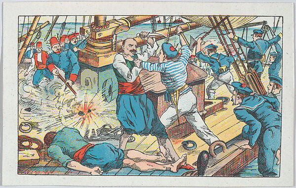 Translation of description on verso: Twelve French sailors take aboard a Turkish vessel, full of troops, equipment, and ammunition. After difficult and heroic work, they managed to transship the enemy, completely emptying the ship in a half hour and later sinking it with cannon fire.