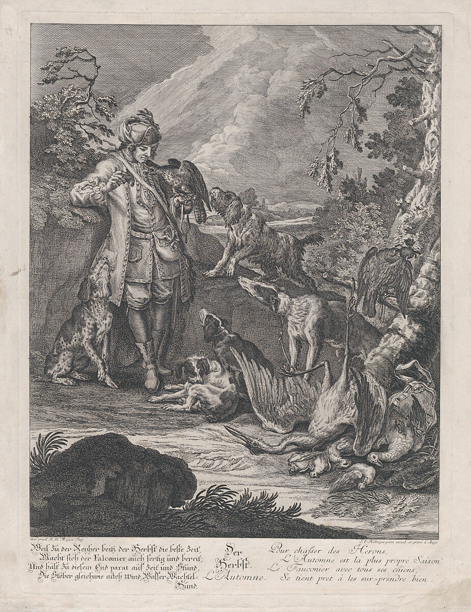 Ridinger worked mostly in Augsburg, Germany, but it was in nearby Regensburg that he was introduced to the aristocratic pursuits that became the predominant subject matter for his long and prolific artistic career. There, at the invitation of Prince Wolf Freiherr von Metternich, Ridinger observed and took part in local hunts, coursing, and shoots while attending the renowned riding academy. In Autumn, an elegant falconer is surrounded by his hounds, whose job it was to flush out the heron. The falcon perched on his arm would bring down the bird as it flew away; a second falcon sits on a branch at the lower right, below which are the heron and a group of smaller game birds.