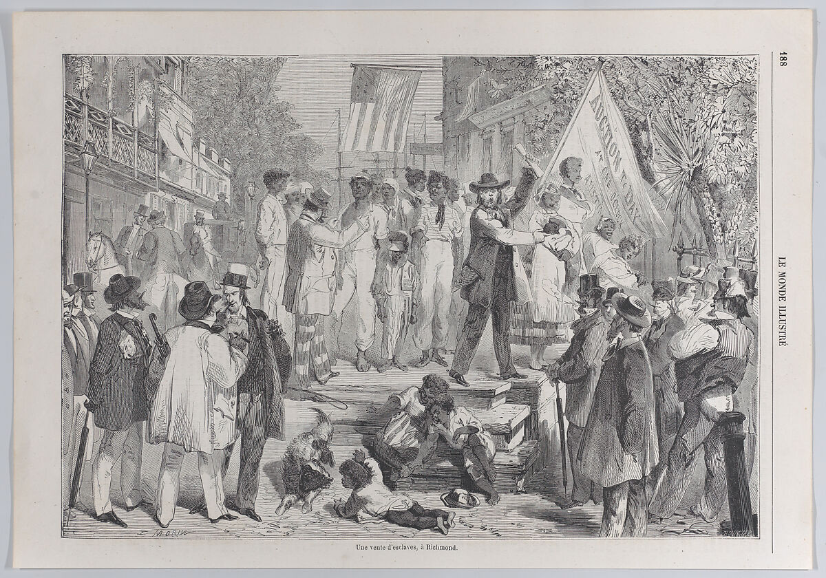 Roughly one month before the outbreak of the American Civil War, "Le Monde Illustré," a French weekly newspaper, published this wood engraving to illustrate an article about the auctions of enslaved people in the southern states. The print shows a public sale in Richmond, Virginia, the largest depot of the trade, besides New Orleans. The condemnatory article animates this "revolting market" by quoting the derogatory sales pitch of the auctioneer gesturing toward the young mother and child at right.