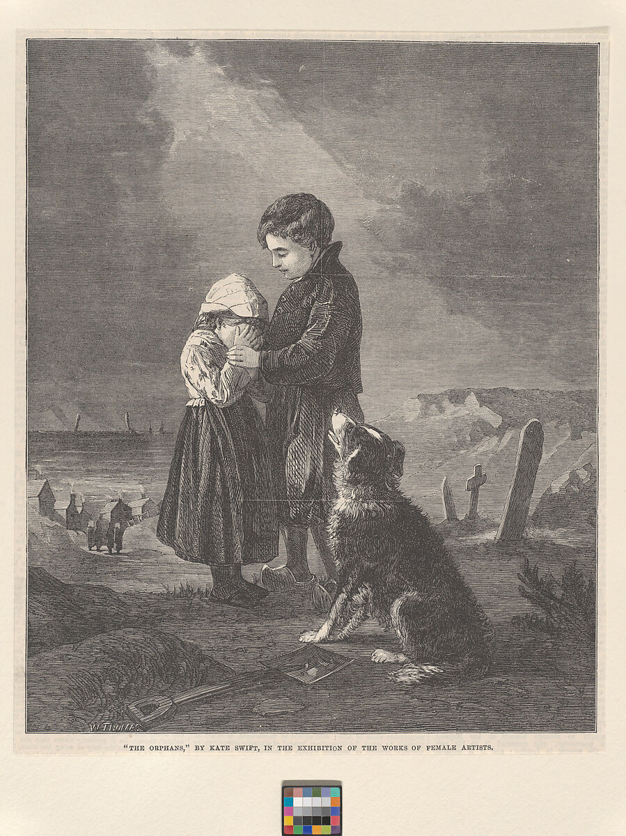 A young Dutch boy, whose nationality is indicated by wooden clogs, comforts a younger sister near a grave above a coastal village. William Luson Thomas’s wood engraving appeared in the "Illustrated London News" in 1867, based on a drawing or painting that Kate Swift showed at the Society of Female Artists that year—the society had been founded in 1857 to bolster the prospects of women artists who could exhibit at the Royal Academy but were not admitted to membership, or allowed to study at the Academy Schools (Swift exhibited at the Society 1857–1901 and at the Academy 1861–80). Primarily a watercolorist, Swift focused on genre subjects. In 1869 she married the Dutch artist Christoffel Bisshop and moved to Scheveningen in the Netherlands, but continued to exhibit in London.