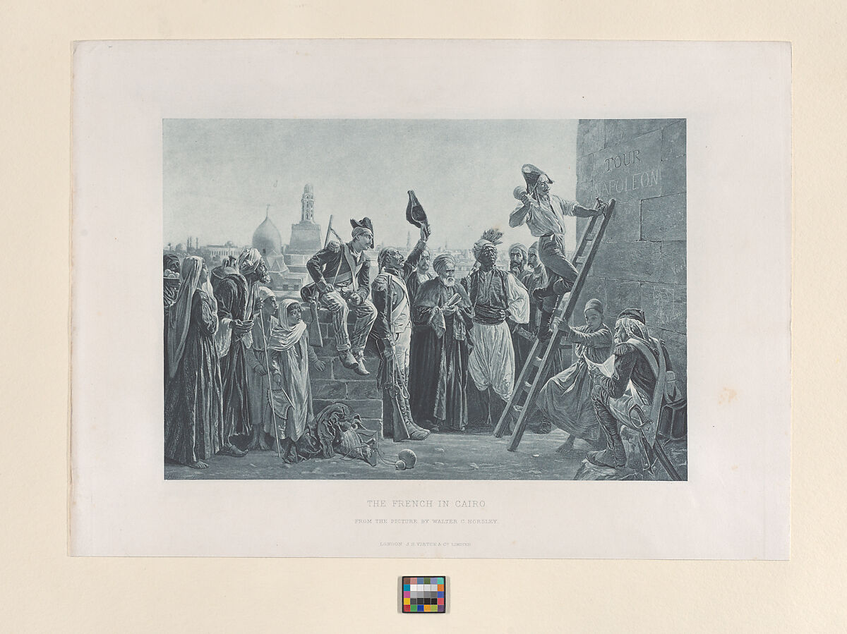 Published in The Art Journal in 1885, this photogravure is based on a painting that Horsley exhibited at the Royal Academy in 1884 (no. 516), now in the Museums Sheffield. The work depicts a range of Egyptians, from a fully veiled woman fruit seller, to a lightly veiled light-skinned woman, a male water carrier, several children, a Muslim cleric, young bearded Arabs, a dark skinned Nubian, and an Ottoman. All observe, a French soldier during the period of Napoleon’s occupation (1798-1801) carving their leader's name into the base of a tower—such inscriptions were placed on the main gates and towers of the city and aroused local resentment. Horsley specialized in Oriental subjects, and travelled to India, Egypt, Tangiers, Morocco and Turkey to gather material. The painting related to his print was conceived shortly after the British took military control of Egypt in 1882 (to secure their access to the Suez Canal). The subject reflects on the nature and unintended effects of military power.