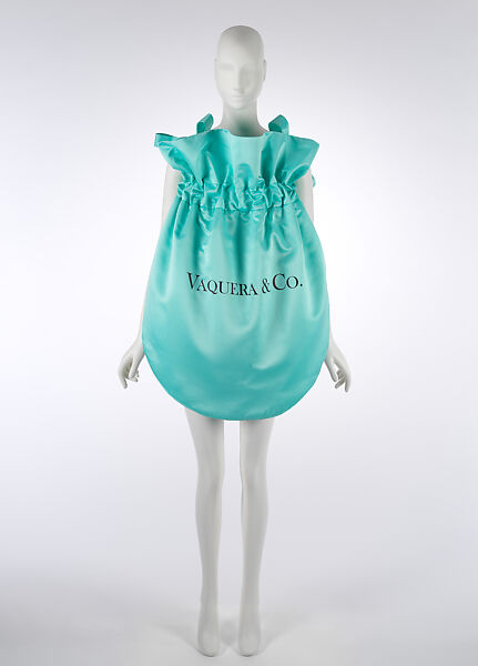 This "Vaquera & Co." dress, a pastiche of the iconic "Tiffany and Co." blue jewelry pouch, queries what remains of the American Dream in the year 2017. More than half a century after the movie based on Truman Capote's novel Breakfast at Tiffany's came out, the Tiffany blue remains unchanged and evokes nostalgia for the elegance of 1950s America, as personified and embodied by Audrey Hepburn's character Holly Golightly.