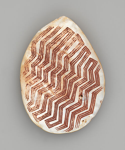 Pearl shell was the highly prized focus of ritual and exchange networks in Australia. Its glistening iridescent qualities embody the shimmer of water, rain, and lightning, evoking ideas of spiritual well-being and ancestral connection. Engraved pearl shell pendants were given to boys during rites that marked their transition to adulthood and were predominantly used and worn by men during ceremonies, attached by belts or necklaces of hair string, with the power to bring rain or heal the sick. Known by a variety of local names (including riji, jakuli, longkalongka) they were, and in many areas still are, exchanged along a vast network of overland trade routes that extends along the western coast and across the vast desert interior as far as Australia’s southern shore, more than a thousand miles away. Carved from the shell of the gold-lipped pearl oyster (Pinctada maxima; a species not endangered in the region), each is engraved with a series of angular geometric motifs which are filled with red ochre and fat, or powdered charcoal to highlight dynamic designs. These linear elements meander across the surface of the lustrous inner lip of the shell and are typically composed of three parallel lines which flow and interlock to create animated designs. The geometry of these interlocking zig-zags and meandering lines indicate the movement of water, so vital to life, in its many manifestations: the rain of storm clouds, the ebb and flow of tides, and the tracks of ancestral beings such as the Lightning Snake across the landscape.