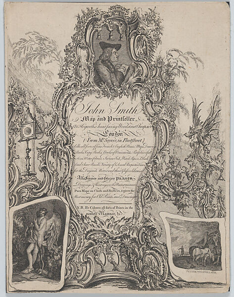 Elaborate trade card for Johns Smith, map and printseller in Cheapside, London. The trade mark is characterized by a large rocaille cartouche with two compartments. In the top compartment Smith's shop sign 'Hogarth's Head' is depicted. The compartment below contains the main text. Around the cartouche several examples of Smith's inventory are shown including a reproduction of a print after Carle Vanloo, and another entitled 'Petite Vue d'Hollande'.