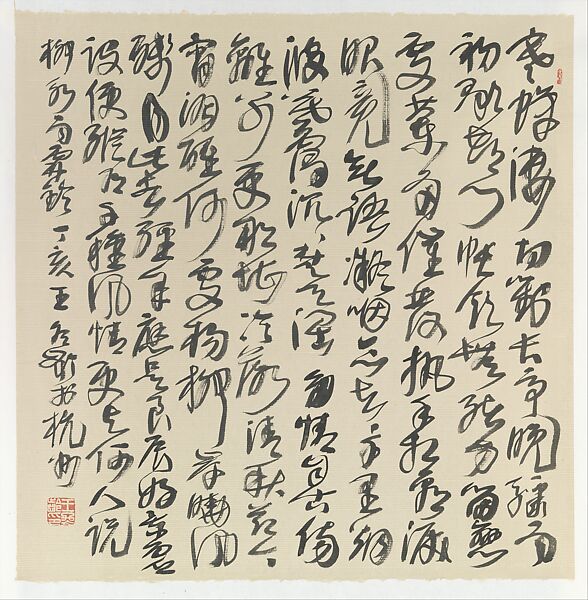 This transcription of a poem by the famed Northern Song poet Liu Yong (柳永, 987–1053) exemplifies Wang Dongling’s command of traditional cursive script. Ten tightly packed columns fill the entire space of the decorated paper and draw our attention to Wang’s energized brushwork. The piece showcases Wang’s unique cursive writing style, in which boldly expansive characters alternate with those that are tightly compressed. These rhythmic shifts in the scale, in which single characters are sometimes expressively unfurled with an emphatic ending stroke of exaggerated length, heightens the sensation of spontaneous execution. Such formal variations enliven the densely written field as the writing undergoes constant compression and expansion. The large characters with their extended endings act like visual punctuations, however they bear no relationship to the text’s content. Such arbitrary shifts in scale hark back to the idiosyncratic cursive styles of Wang Duo (1592–1652) and Fu Shan (1607–1684). But unlike those artists, Wang Dongling did not adopt a traditional handscroll or hanging scroll format. Instead, he chose the challenging square format whose uniformly figured field reveals a modernist sensibility reminiscent of Western action painting.
