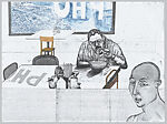 Daniel Heyman is known for using a variety of printmaking materials and techniques in experimental ways—such as layering gouache monotype with intaglio and aquatint--to create works that combine text (often transcriptions of interviews or oral statements) with imagery such as portraits and details from landscapes. Heyman deconstructs and challenges assumptions about "political" art by combining personal stories and other elements from either his or his subjects’ histories. Often he combines his narrative with that of his subject, describing both one’s experience and his feelings upon hearing the stories. In this way, he challenges the concept of narratives and questions their power and influence. This piece, Fall: Artist Eats Pho, is taken from a series devoted to the four seasons. In Summer: Artist Sleeps 2010, Heyman is shown peacefully sleeping on a hammock outdoors, while in Fall: Artist Eats Pho 2011, Heyman depicts himself eating at a Vietnamese restaurant. The image of the artist enjoying a bowl of pho is juxtaposed with that of Hung Nguyen, a refugee from Vietnam whose harrowing story of life in Vietnam and escape to America is described in the text comprising the bottom third of the print. Winter: Artist Engages, 2012 is a double portrait of Heyman, both figures shown nude and intertwined. Behind him is a full moon and detail showing an owl and a winter landscape. Finally in Spring: Artist Contemplates (Inheritance) 2012, Heyman shows himself from the back, holding an ivory sculpture of three men fighting. In this series, Heyman uses the seasons to describe the passage from youth to adulthood, as well as to show his own journey from the carefree summer slumber to that of political awareness, to wrestling with himself, to finally contemplation of art and life itself in a protected interior space.