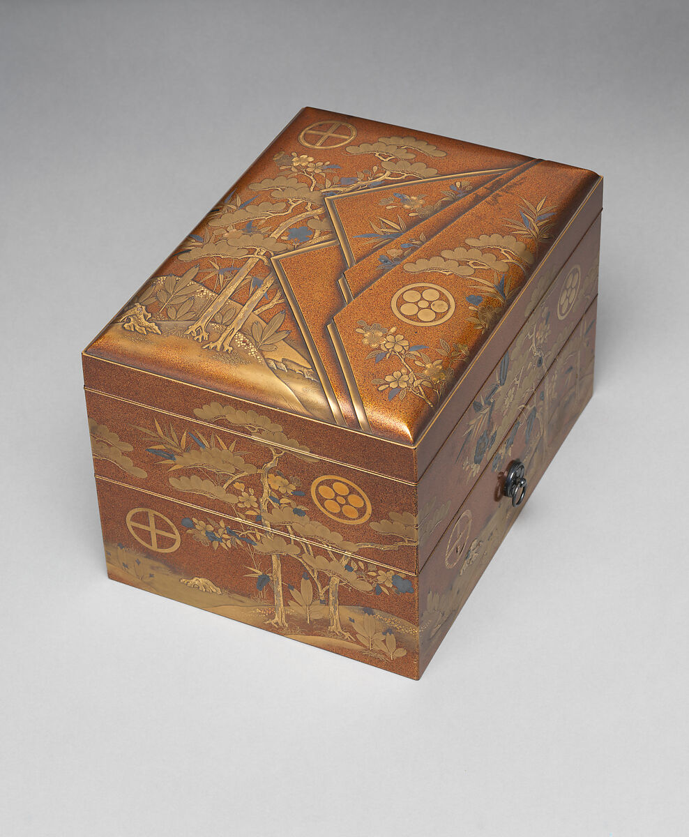 This lacquer box for eyebrow cosmetics, including a variety of brushes, was part of a spectacular wedding trousseau. It was commissioned to celebrate the marriage of Princess Taka (1809–1862) of the Shimazu clan (one of the wealthiest and most politically influential daimyo families of the time) to a son of the Matsudaira clan, relatives of the Tokugawa. The two family crests on the piece—the Shimazu cross in a circle and the Matsudaira stylized plum flower—symbolize the union. The pine and bamboo motifs are auspicious symbols associated with longevity and resilience and allude to good wishes for a happy marriage.