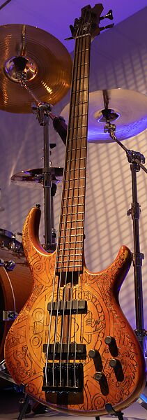 This work of art is currently on loan to the museum.Robert Trujillo began using this five-string bass guitar, with an additional string below the standard four strings of most basses, on Metallica’s World Magnetic tour in 2008. Paying tribute to his indigenous heritage, the bass is decorated with a wood-burned design based on an Aztec calendar that was created by Trujillo’s wife, artist Chloe Trujillo.