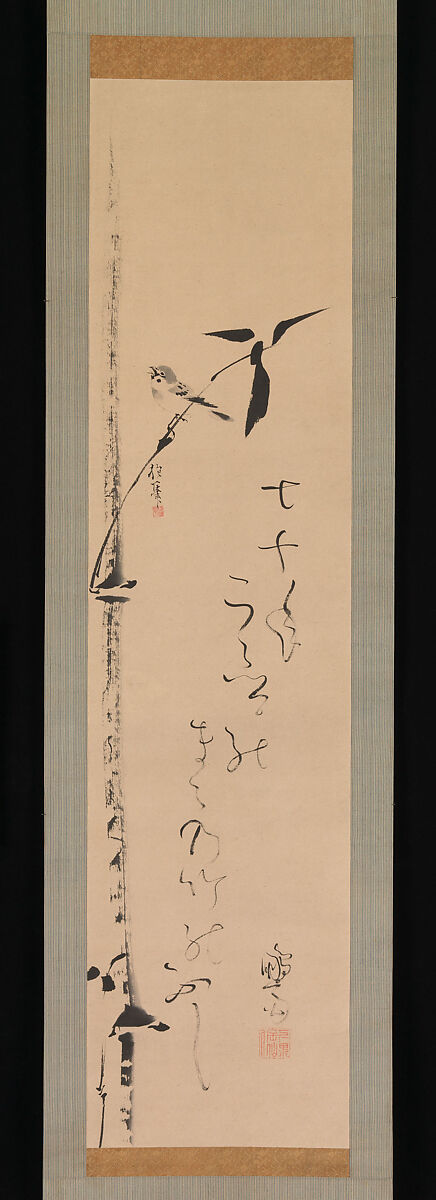 In this narrow composition a sparrow balances on a branchlet of bamboo; the silvery tones of the primary stalk contrast with the dark ink of its leaves and joints. Sakai Hōitsu is best known for his revival of the art of Rinpa-school master Ogata Kōrin (1658–1716) and for his polychrome paintings in the Rinpa style. He was also a master of ink, however, as this lively collaborative work indicates.